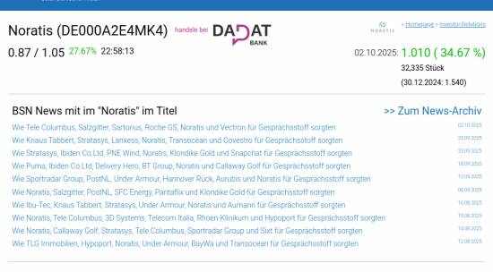 Noratis am 2.10. 34,67%, Volumen 630% normaler Tage