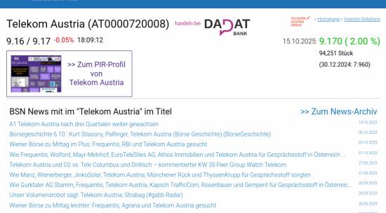 Telekom Austria am 15.10. 2,00%, Volumen 126% normaler Tage