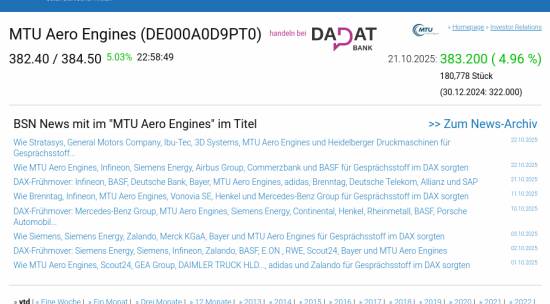 MTU Aero Engines am 21.10. 4,96%, Volumen 127% normaler Tage