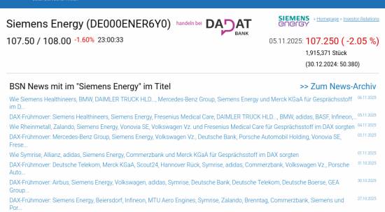 Siemens Energy am 5.11. -2,05%, Volumen 64% normaler Tage