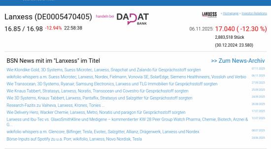 Lanxess am 6.11. -12,30%, Volumen 714% normaler Tage