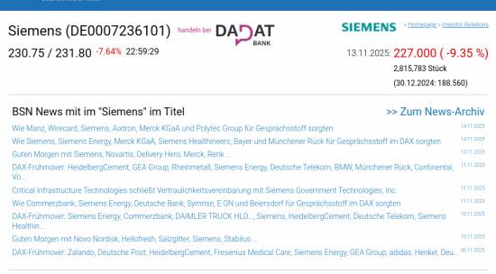 Siemens am 13.11. -9,35%, Volumen 226% normaler Tage