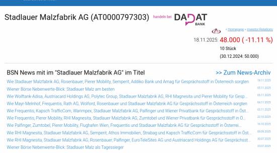Stadlauer Malzfabrik AG am 18.11. -11,11%, Volumen 8% normaler Tage