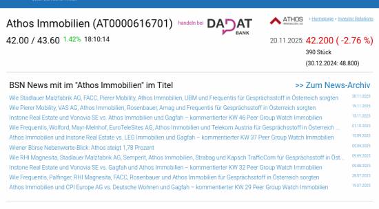 Athos Immobilien am 20.11. -2,76%, Volumen 165% normaler Tage