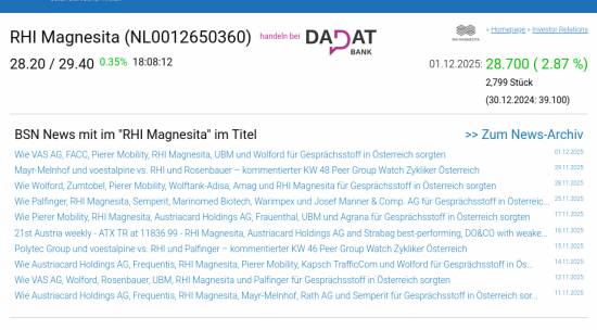 RHI Magnesita am 1.12. 2,87%, Volumen 63% normaler Tage
