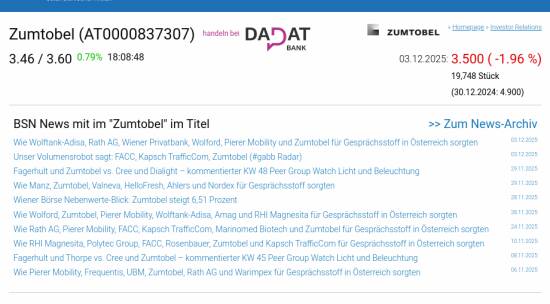 Zumtobel am 3.12. -1,96%, Volumen 88% normaler Tage