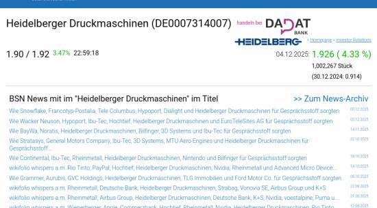 Heidelberger Druckmaschinen am 4.12. 4,33%, Volumen 117% normaler Tage