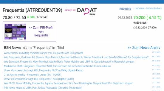 Frequentis am 9.12. 4,15%, Volumen 127% normaler Tage