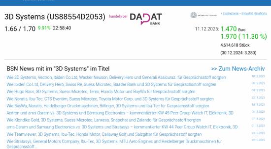 3D Systems am 11.12. 11,30%, Volumen 124% normaler Tage