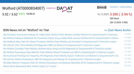 Wolford am 16.12. -2,94%, Volumen 68% normaler Tage