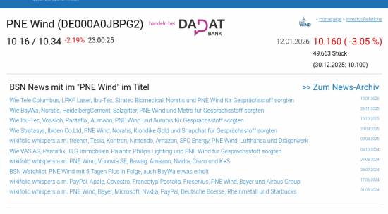 PNE Wind am 12.1. -3,05%, Volumen 138% normaler Tage