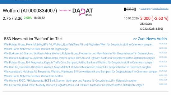 Wolford am 15.1. -2,60%, Volumen 12% normaler Tage
