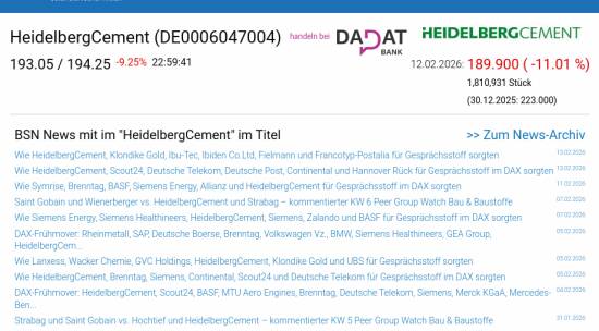 HeidelbergCement am 12.2. -11,01%, Volumen 470% normaler Tage