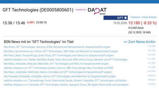 GFT Technologies am 16.2. -8,33%, Volumen 406% normaler Tage