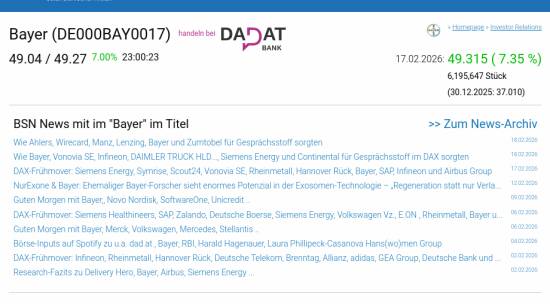Bayer am 17.2. 7,35%, Volumen 167% normaler Tage