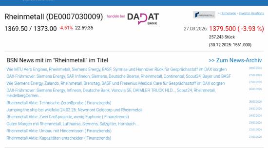 Rheinmetall am 27.3. -3,93%, Volumen 111% normaler Tage