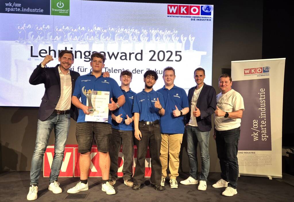 FACC Future Team holt Platz 1 bei WKO Lehrlingsaward: Die erfolgreiche Future Crew der FACC im Rahmen der feierlichen Preisverleihung v.l.n.r.: Simon Pascal-Klär (Kunststoffverfahrenstechniker), Laurenz Hager-Roiser (Kunststoffverfahrenstechniker), Özcan Dinc (Zerspanungstechniker), Marvin Schratzberger (Konstrukteur)