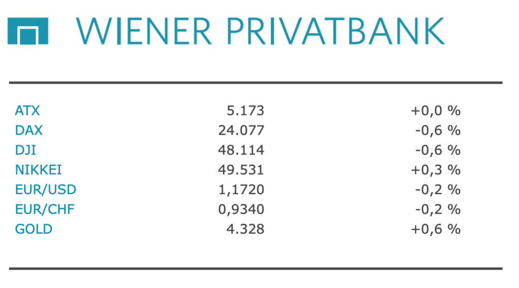 Aus den Morning News der Wiener Privatbank: "Am Wiener Aktienmarkt hat der ATX gestern Dienstag mit mäßigem Elan an seine Rekordrally angeknüpft. Nachdem moderate Gewinne aus dem frühen Verlauf bald wieder abgebröckelt waren, schloss der heimische Leitindex mit einem kleinen Plus von 0,04 Prozent auf 5.173,28 Punkten. Im Tageshoch hatte er erstmals Luft über 5.200 Punkten getestet. Für den ATX Prime ging es 0,04 Prozent auf 2.569,99 Zähler hinauf. Im europäischen Umfeld gab es überwiegend Abgaben zu sehen.