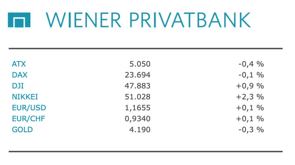 Aus den Morning News der Wiener Privatbank: "Die Wiener Börse hat gestern Mittwoch nach ihrem jüngsten Höhenflug etwas schwächer geschlossen. Der ATX stand zum Handelsende mit minus 0,42 Prozent bei 5.050,17 Punkten. Zum Handelsstart hatte der Leitindex zunächst seine Rekordserie mit einem neuen Allzeithoch von gut 5.075 Punkten fortgesetzt. Der ATX Prime fiel um 0,41 Prozent auf 2.510,59 Zähler. An den übrigen europäischen Börsen war zur Wochenmitte kein klarer Trend erkennbar. Die Marktakteure verfolgen weiterhin die Bemühungen um einen Frieden in der Ukraine. Nach Gesprächen zwischen Präsident Wladimir Putin und einer US-Delegation am Dienstagabend seien Russland und die USA nach Moskauer Darstellung einem Ende des Kriegs zwar nicht näher gekommen, Russland signalisierte jedoch weitere Gesprächsbereitschaft. Zudem belasteten überraschend schwach ausgefallene Daten vom US-Arbeitsmarkt den Leitindex am Nachmittag etwas.