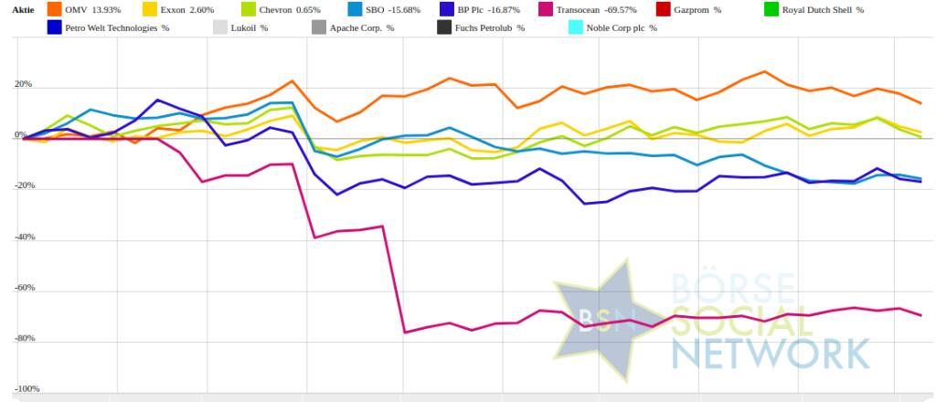 Weitere Highlights: Transocean ist nun 3 Tage im Minus (10,98% Verlust von 3,46 auf 3,08), ebenso Chevron 3 Tage im Minus (3,88% Verlust von 154,91 auf 148,9), Exxon 3 Tage im Minus (3,09% Verlust von 114,26 auf 110,73).