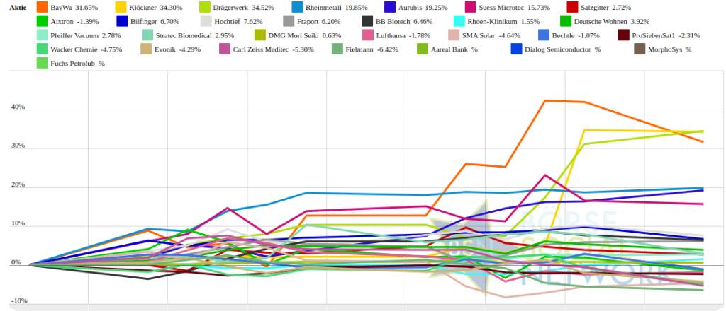 In der Monatssicht ist vorne: BayWa 68,34% vor Drägerwerk 36,9% , Klöckner 32,69% , Aurubis 26,79% , Rheinmetall 23,12% , Suess Microtec 21,12% , Aixtron 16,18% , Salzgitter 13,7% , Fraport 9,38% , Hochtief 8,07% , Fuchs Petrolub 7,24% , Bilfinger 6,01% , SMA Solar 5,51% , BB Biotech 4,93% , Pfeiffer Vacuum 3,84% , Deutsche Wohnen 3,66% , Stratec Biomedical 3,64% , Dialog Semiconductor 3,63% , DMG Mori Seiki 0,85% , Wacker Chemie 0,37% , Aareal Bank 0,3% , MorphoSys 0,15% , ProSiebenSat1 0,08% , Rhoen-Klinikum 0% , Bechtle -0,51% , Lufthansa -1,66% , Evonik -3,12% , Fielmann -5,33% , Carl Zeiss Meditec -6,39% und