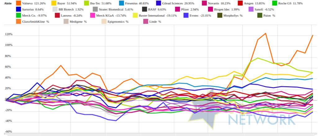 Weitere Highlights: Evotec ist nun 5 Tage im Plus (13,69% Zuwachs von 5,93 auf 6,74), ebenso Roche GS 5 Tage im Plus (13,14% Zuwachs von 253,5 auf 286,8), Biogen Idec 5 Tage im Plus (14,43% Zuwachs von 135,67 auf 155,25), Sartorius 4 Tage im Plus (18,62% Zuwachs von 193,05 auf 229), BASF 3 Tage im Plus (4,44% Zuwachs von 42,39 auf 44,27), Stratec Biomedical 3 Tage im Plus (9,42% Zuwachs von 28,65 auf 31,35), Epigenomics 3 Tage im Minus (5,33% Verlust von 0,45 auf 0,43).