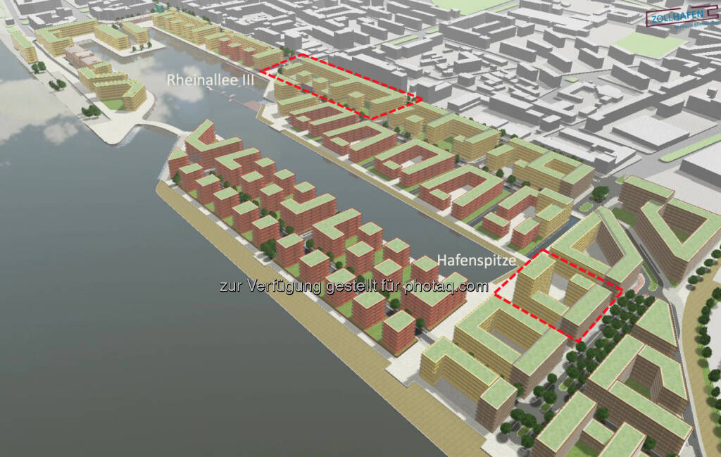 CA Immo kauft zwei Baufelder im Zollhafen Mainz: Hier eine abstrakte Baumassenvisualisierung mit Lage der Baufelder Hafenspitze und Rheinallee III (Quelle: Zollhafen Mainz)