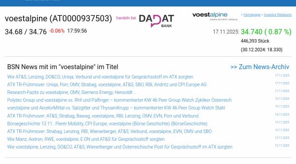 voestalpine am 17.11. 0,87%, Volumen 142% normaler Tage