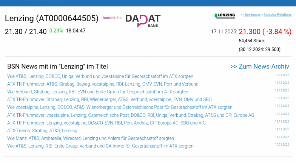 Lenzing am 17.11. -3,84%, Volumen 97% normaler Tage