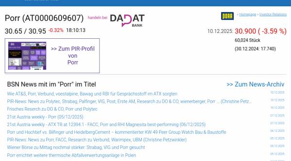 Porr am 10.12. -3,59%, Volumen 92% normaler Tage