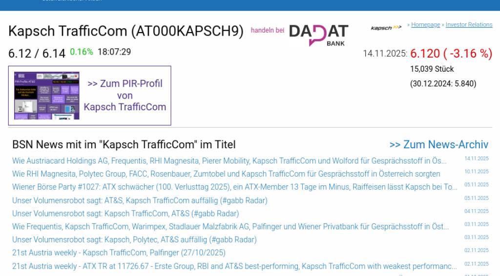 Kapsch TrafficCom am 14.11. -3,16%, Volumen 203% normaler Tage