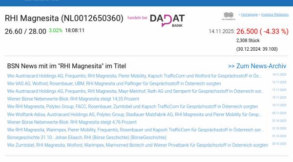 RHI Magnesita am 14.11. -4,33%, Volumen 52% normaler Tage