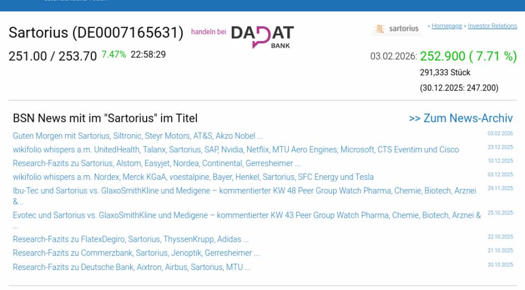 Sartorius am 3.2. 7,71%, Volumen 310% normaler Tage