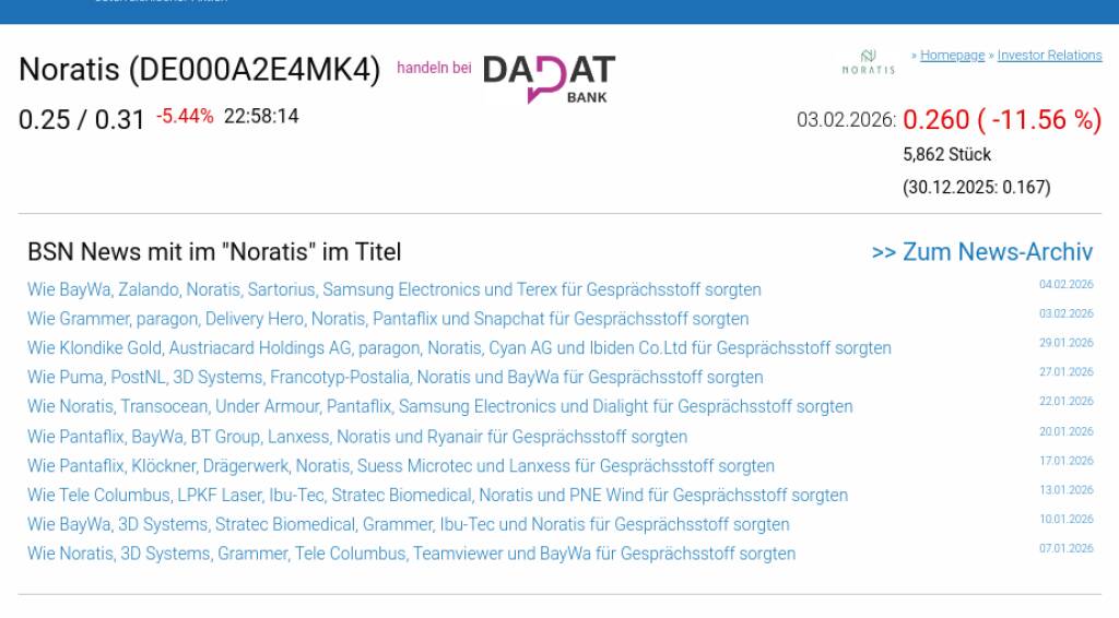 Noratis am 3.2. -11,56%, Volumen 27% normaler Tage