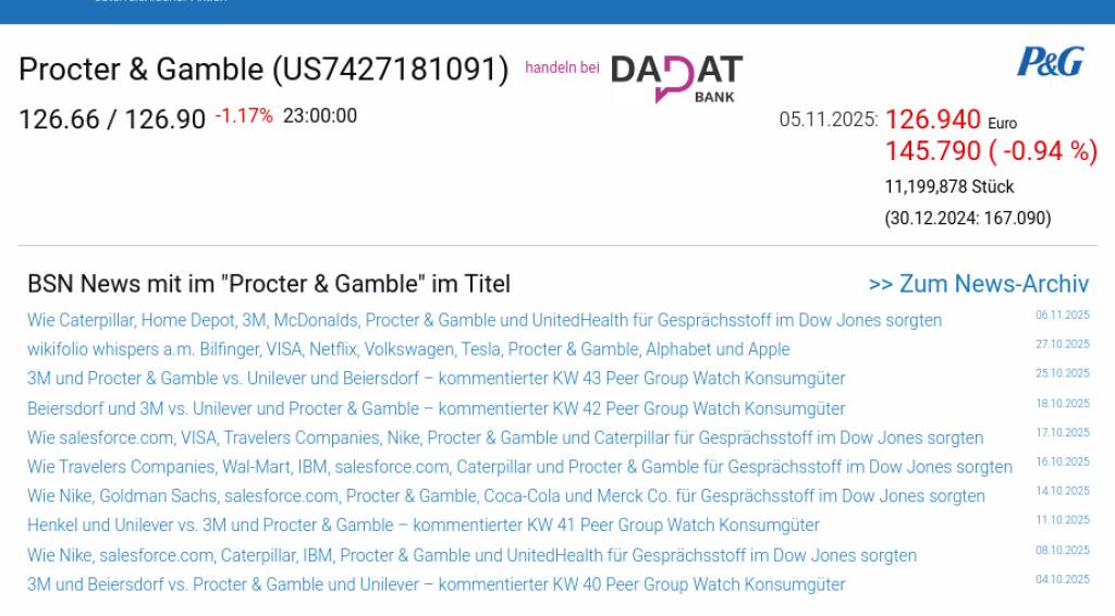 Procter & Gamble am 5.11. -0,94%, Volumen 141% normaler Tage