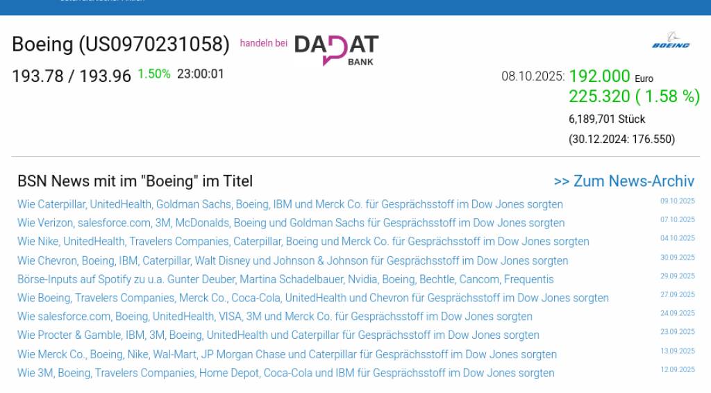 Boeing am 8.10. 1,58%, Volumen 74% normaler Tage