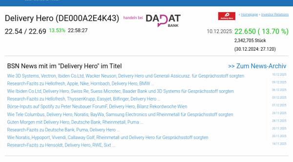 Delivery Hero am 10.12. 13,70%, Volumen 275% normaler Tage