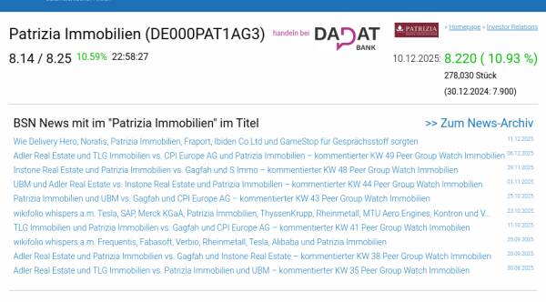 Patrizia Immobilien am 10.12. 10,93%, Volumen 419% normaler Tage
