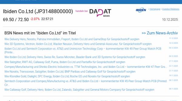 Ibiden Co.Ltd am 10.12. -5,52%, Volumen 0% normaler Tage