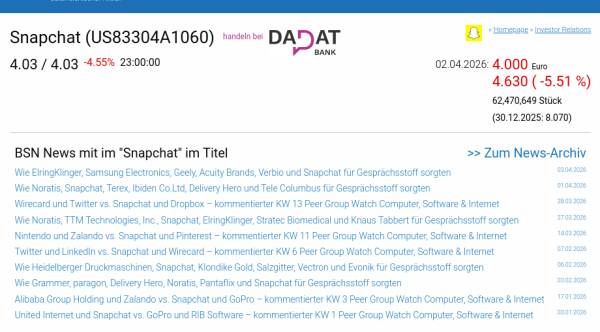 Snapchat am 2.4. -5,51%, Volumen 120% normaler Tage