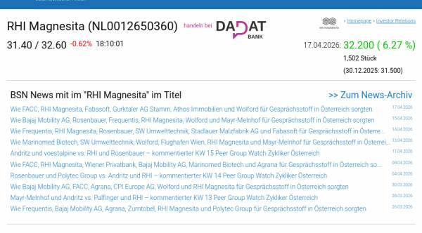 RHI Magnesita am 17.4. 6,27%, Volumen 29% normaler Tage