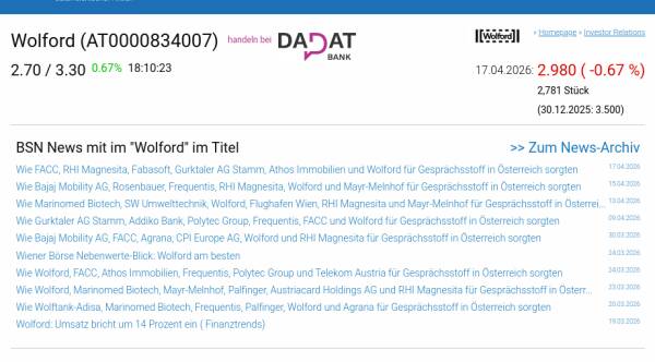 Wolford am 17.4. -0,67%, Volumen 335% normaler Tage