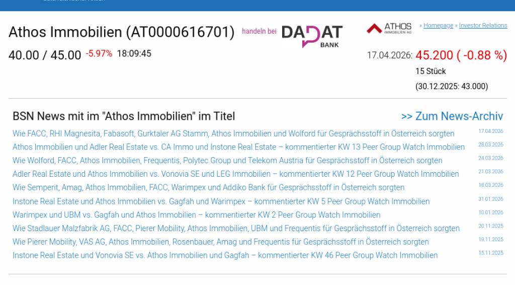 Athos Immobilien am 17.4. -0,88%, Volumen 6% normaler Tage