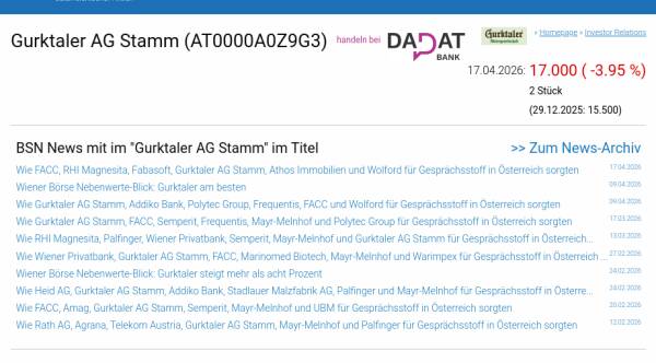 Gurktaler AG Stamm am 17.4. -3,95%, Volumen 2% normaler Tage