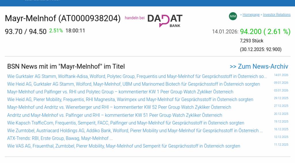 Mayr-Melnhof am 14.1. 2,61%, Volumen 73% normaler Tage