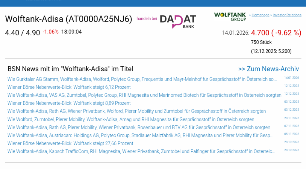 Wolftank-Adisa am 14.1. -9,62%, Volumen 111% normaler Tage