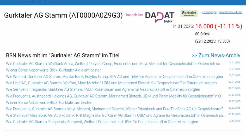 Gurktaler AG Stamm am 14.1. -11,11%, Volumen 120% normaler Tage