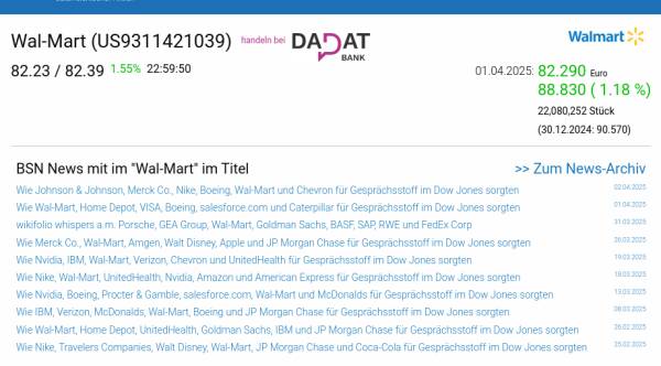Wal-Mart am 1.4. 1,18%, Volumen 108% normaler Tage