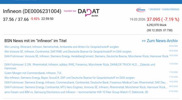 Infineon am 19.3. -7,19%, Volumen 146% normaler Tage