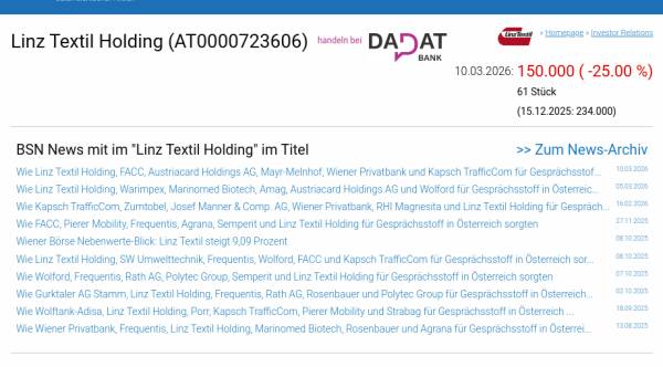 Linz Textil Holding am 10.3. -25,00%, Volumen 338% normaler Tage
